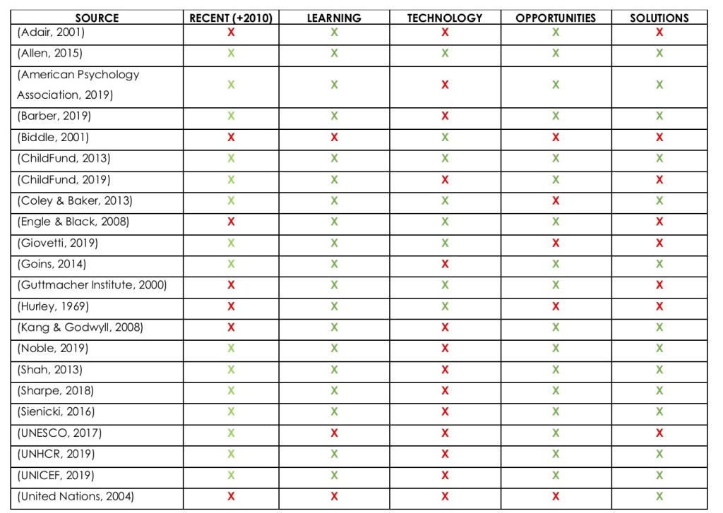 Figure 2: Table of the references used in the research with different evaluation criteria depending if the information above is mentioned in the document or the documents is about it (recent, learning, technology, opportunities and solutions).